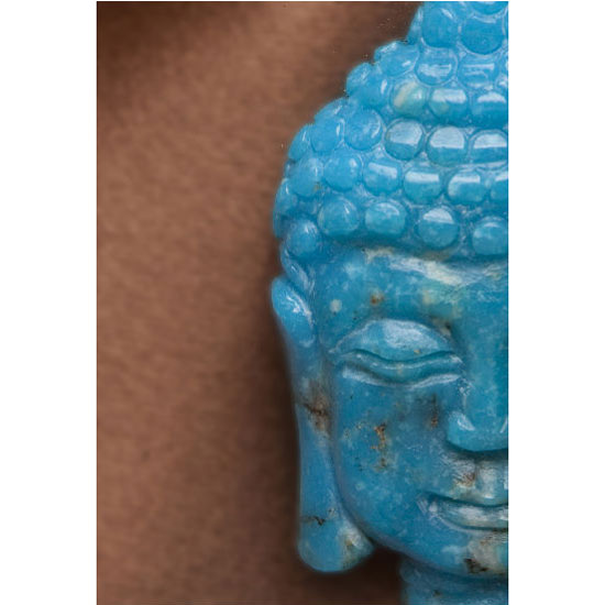 Featured here is a piece of carved Arizona turquoise from the Kingman mine. The merciful and peaceful face of the Buddha is created on the beautiful stone. Natural patterns add texture and detail to this carving.