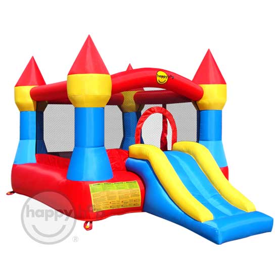 Showcased here is a cute castle bouncer designed in red, blue and yellow. The inflatable structure allows kids to have fun safely. Side protectors are added to the slide for user's safety.