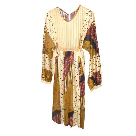This is a long-sleeved dress for casual wearing. The dress has a loose cutting and features a pattern of dots and stars. There are ribbons on the two sides of the waistline as embellishment.