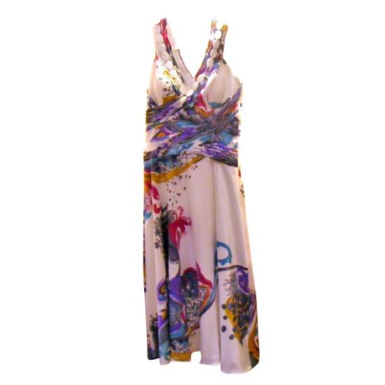 This is a piece of casual dress for ladies. The sleeveless dress features some artistic patterns of different colours, such as purple, blue and red, on a white background. It is perfect for wearing in summer and spring.