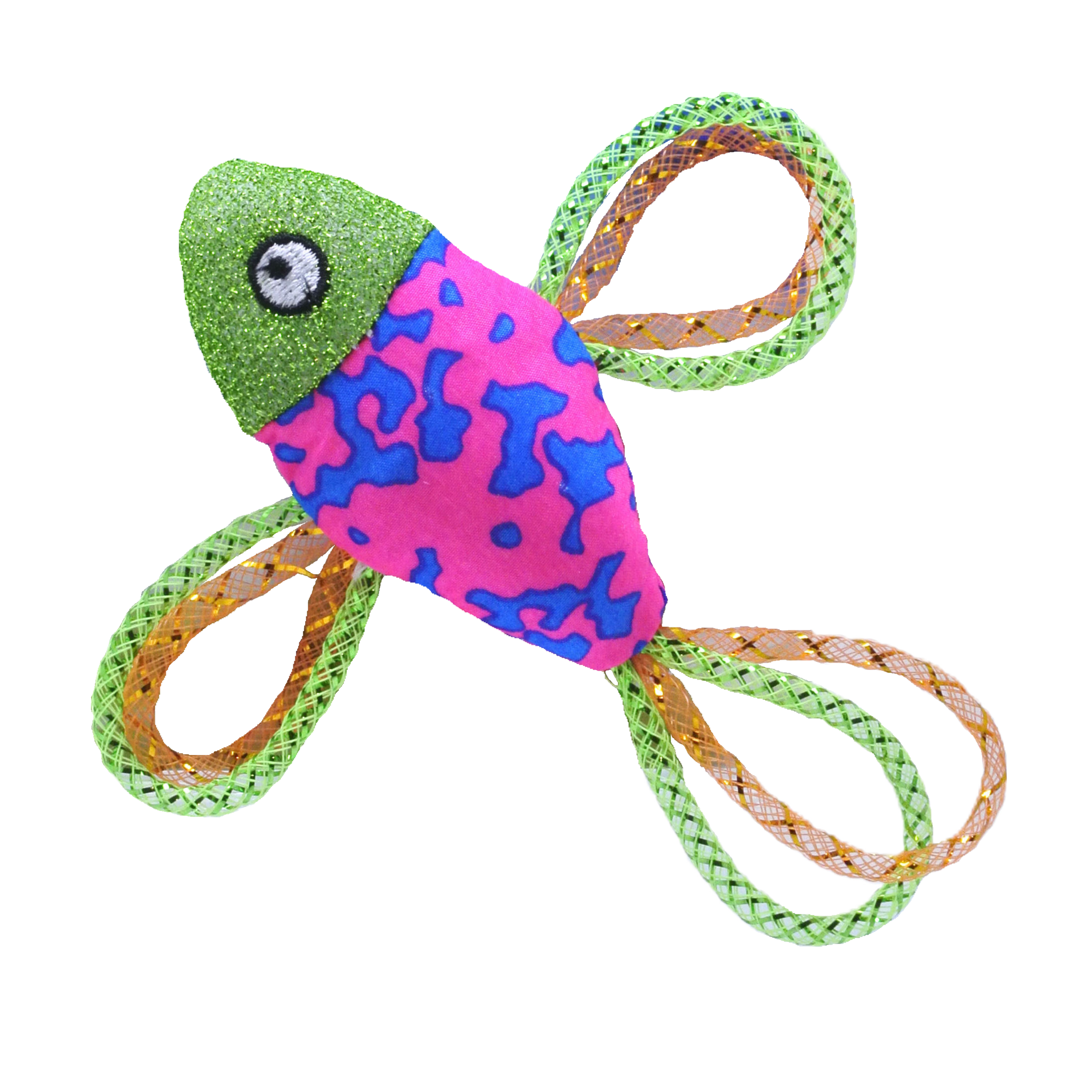 Let your cat dive into a sea of fun with the Glitter Fish Flutter! This vibrant fish-shaped toy features a shimmering head, a soft body, and a tail made of fluttery mesh ribbons and feathers—perfect for batting, chasing, and solo play.