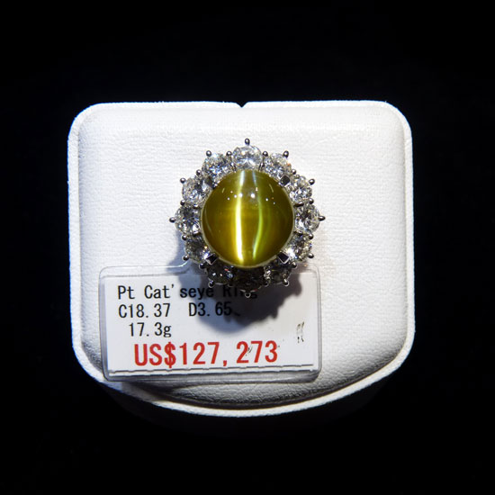 Featuring a precious, well-polished cat's eye stone, this finger ring is elegant and gorgeous. The cat's eye stone with a well-defined surface exhibits a sharp and centered eye. Encircled with diamonds, this sparkling cat's eye stone ring will nicely adorn your finger.