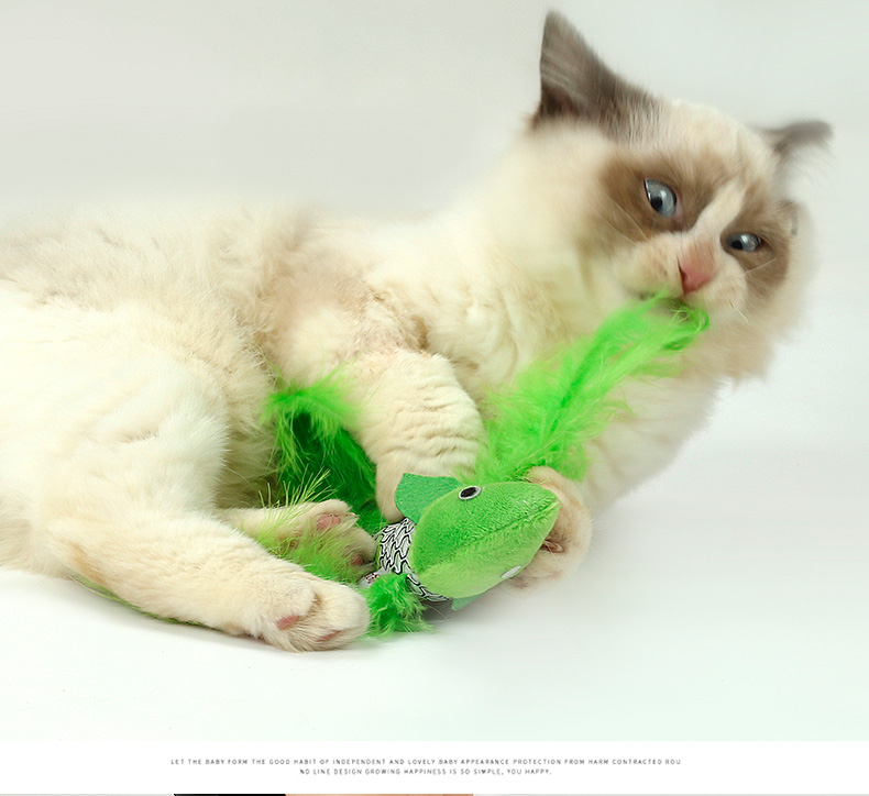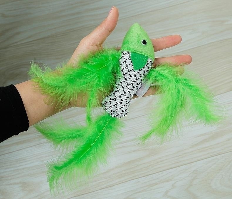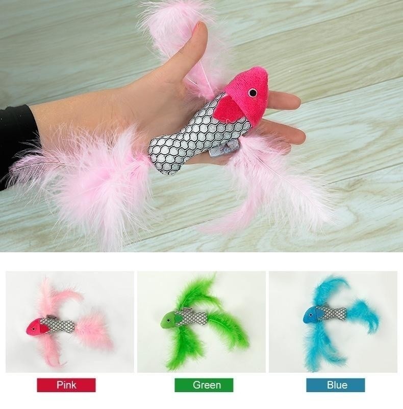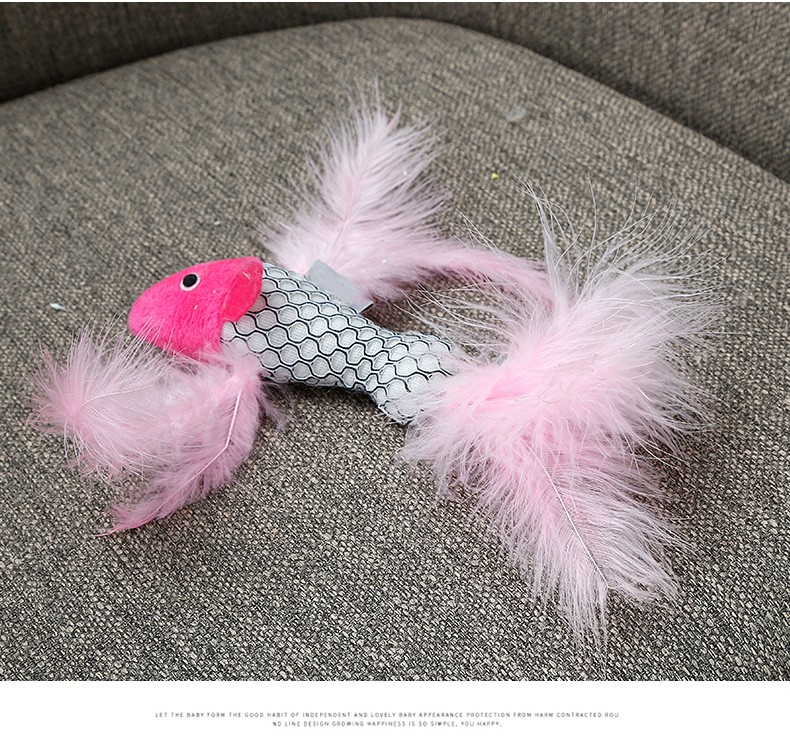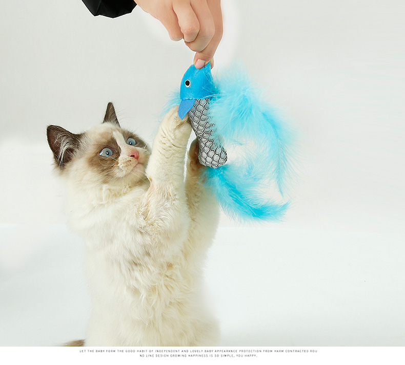 1. Fish-shaped with feather, the image is realistic, the cat loves it.
