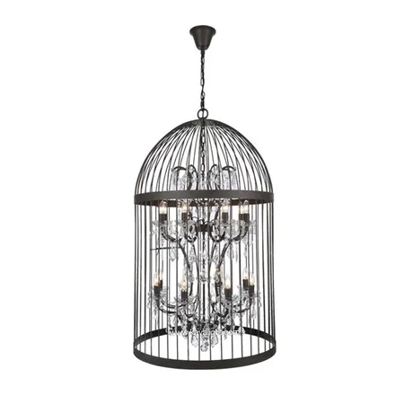 This is a ceiling chandelier that comes in a birdcage shape. Made of metal, this sturdy chandelier showcases a rusty color for a vintage style. This fashionable ceiling chandelier is decorated with large crystals.