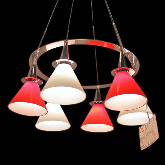 The ceiling lamp is composed of a circular frame with 6 lamp shades. 3 red shades come with 3 white shades to create sharp contrasting effect. It is mounted on ceilings by wires.