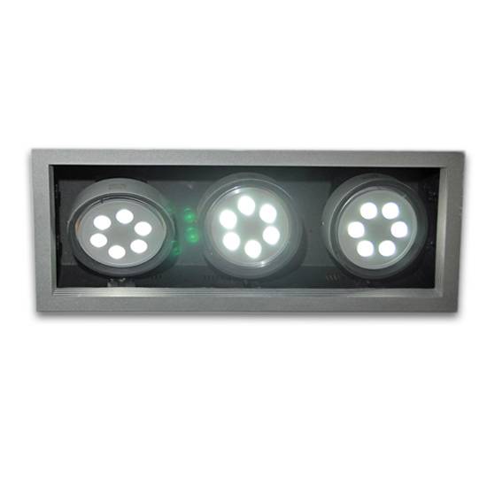 This ceiling lamp has a gray rectangular casing. The inner casings of the ceiling lamps are round in shape. They are made of aluminium and steel.