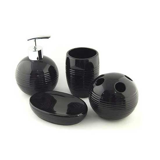 This elegant bathroom set includes a soap dispenser, a toothbrush holder, a cup and a soap dish. The ceramic structure in allover black gives an attractive look. This bathroom set is completed in a highly glossy finish.