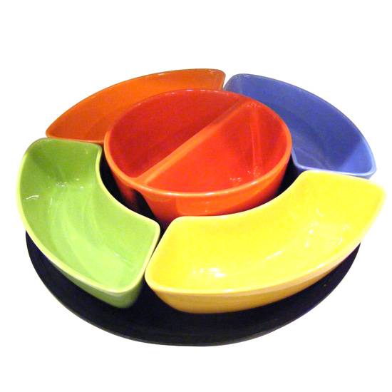 The items shown on the picture is a ceramic bowl set with five bowls. The bowls are in assorted colours which are orange, blue, yellow, green and red, showing a vivid and colourful design.