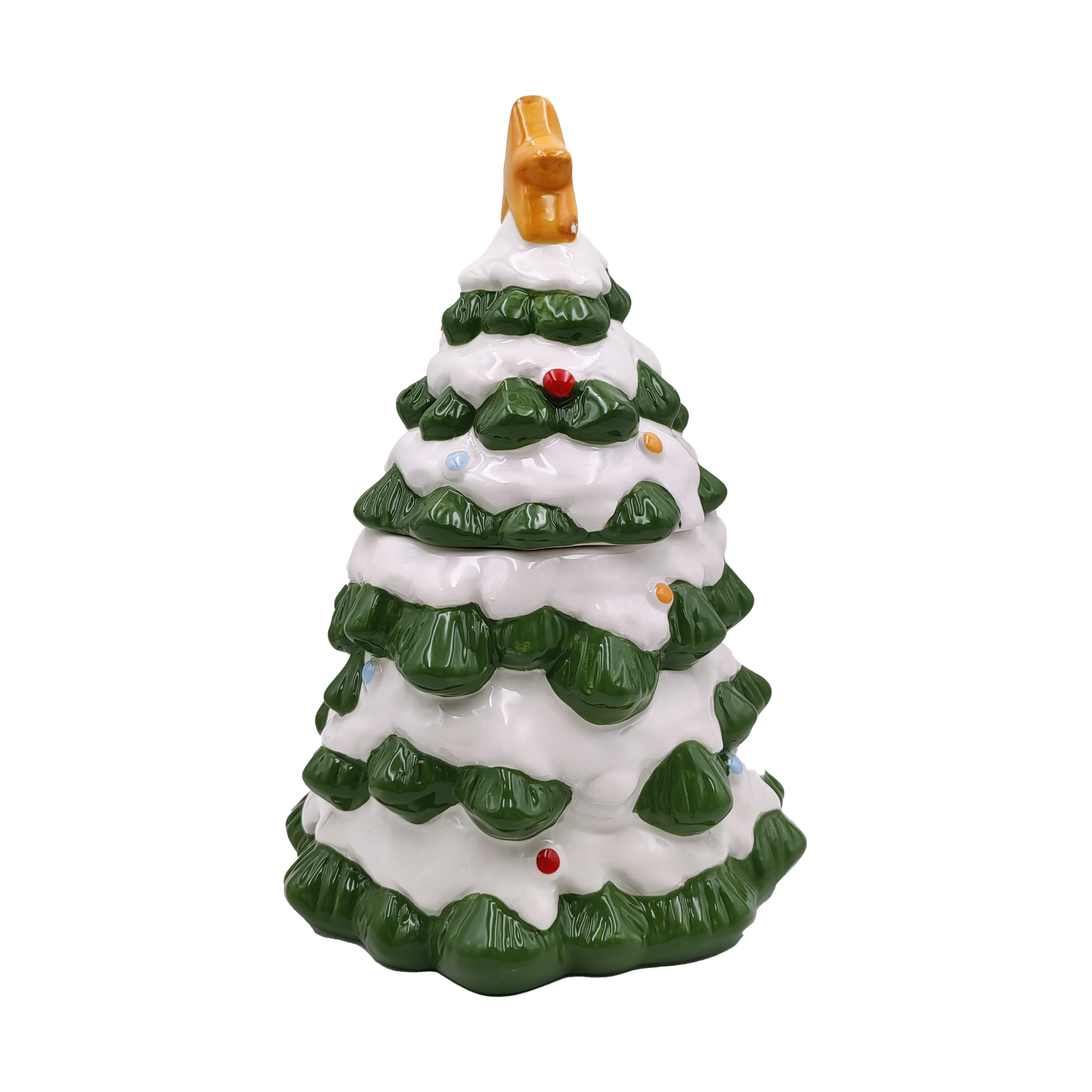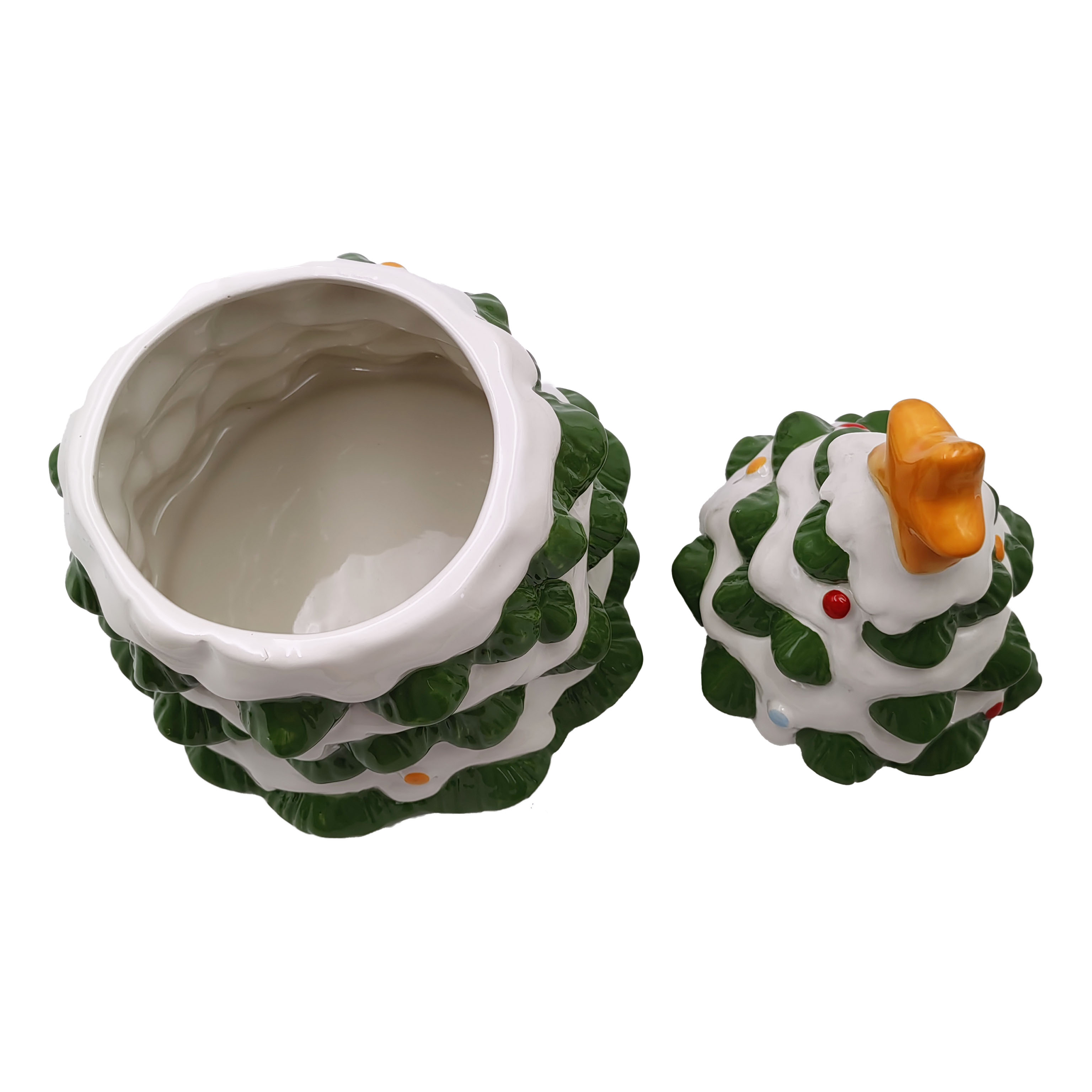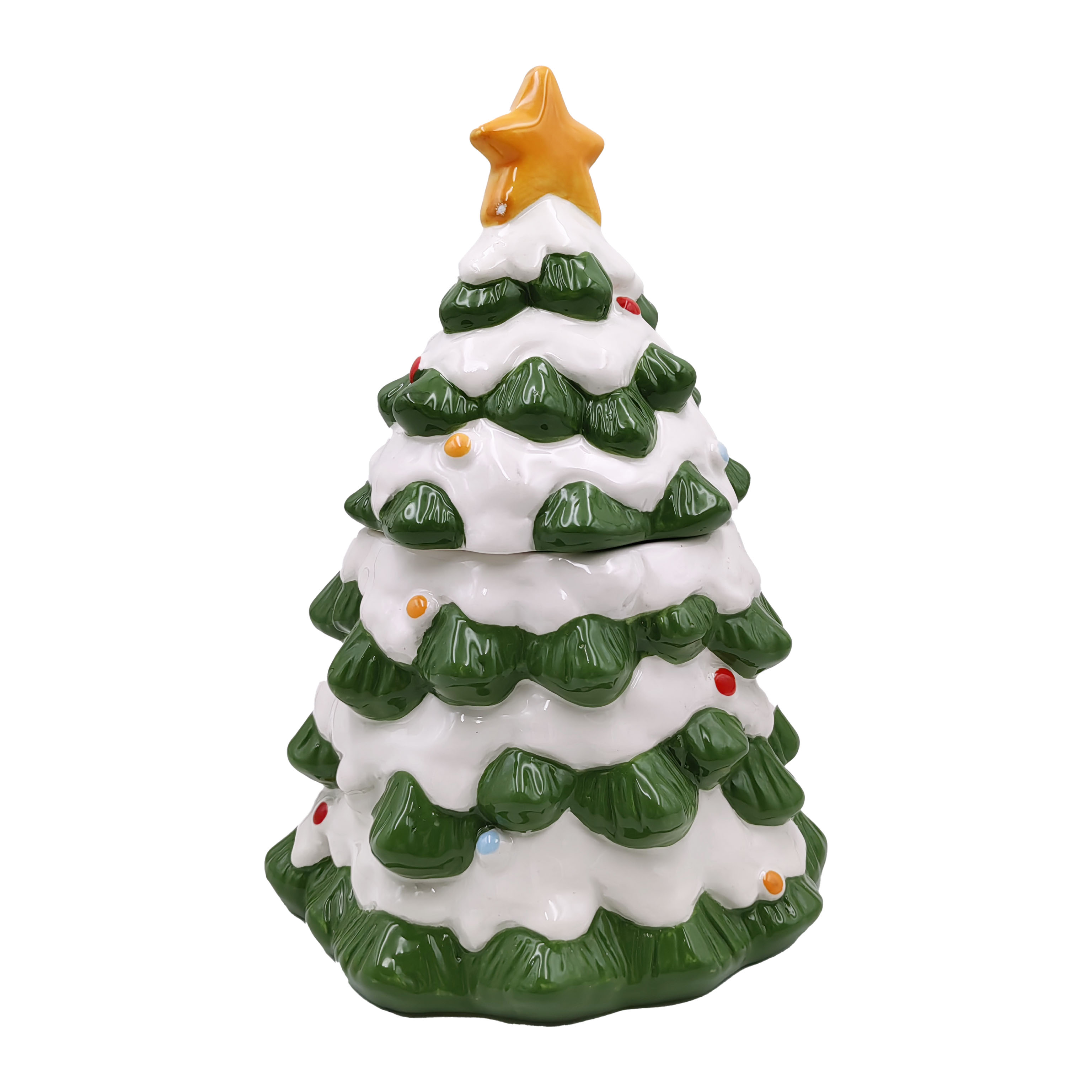 • Item Name: Ceramic Christmas Tree Jar with Star Lid Festive Green and White Holiday Decor