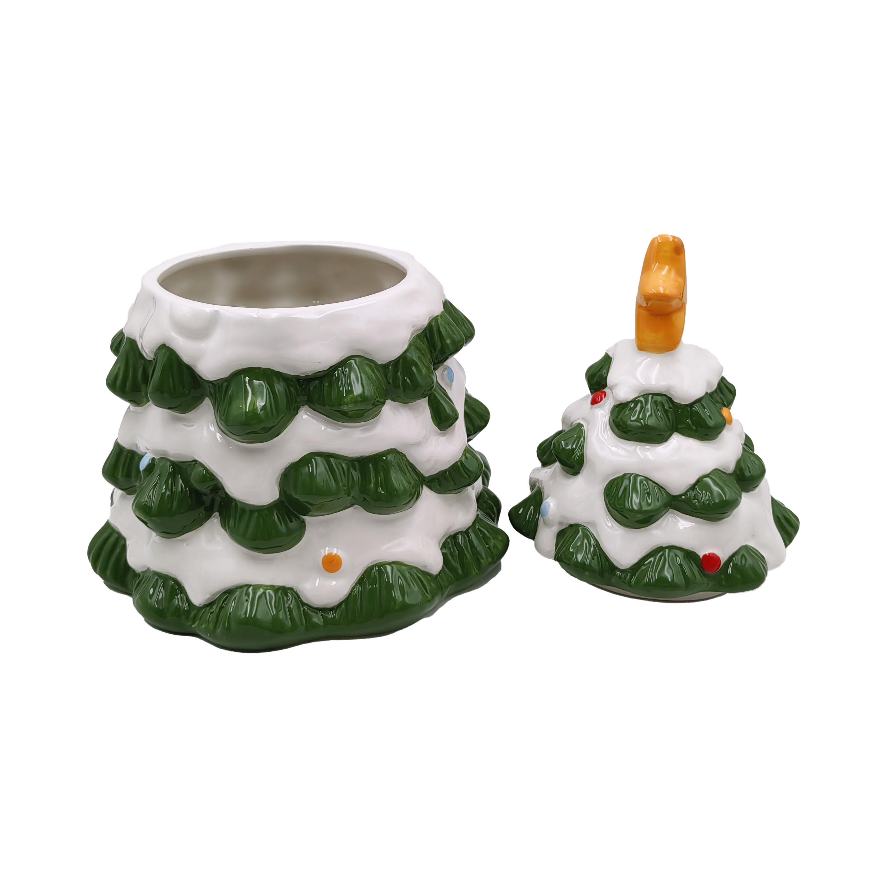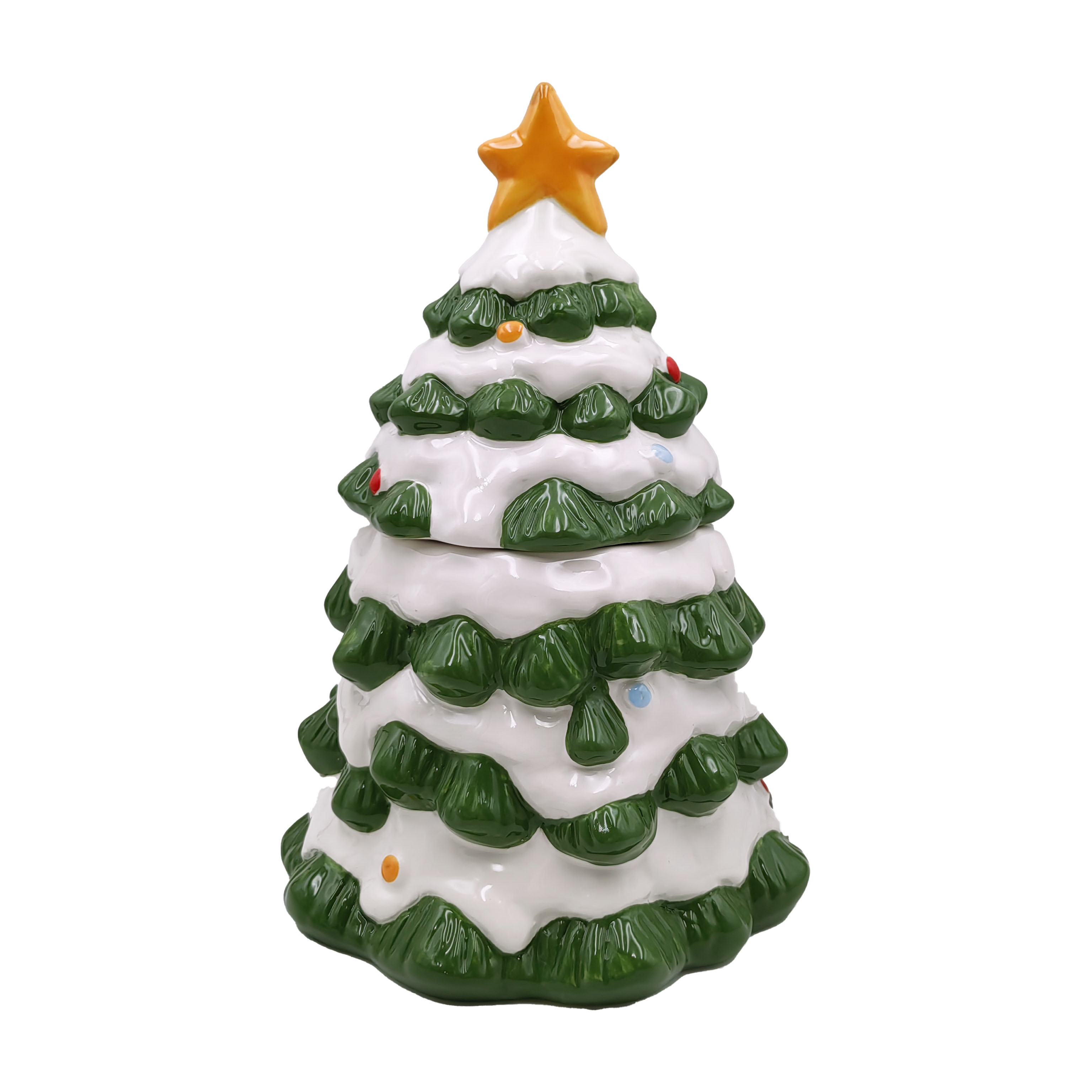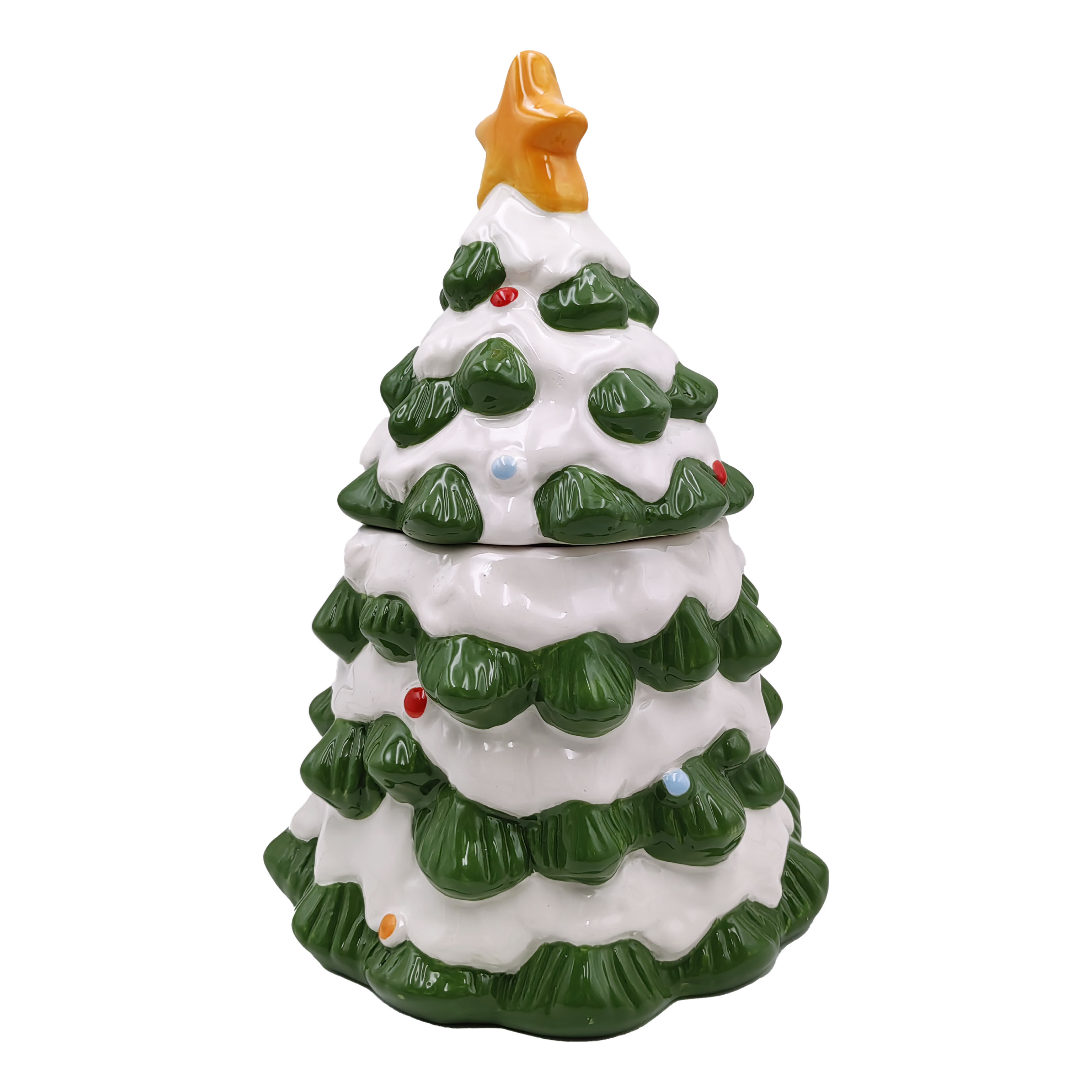 Ceramic Christmas Tree Jar with Star Lid Festive Green and White Holiday Decor