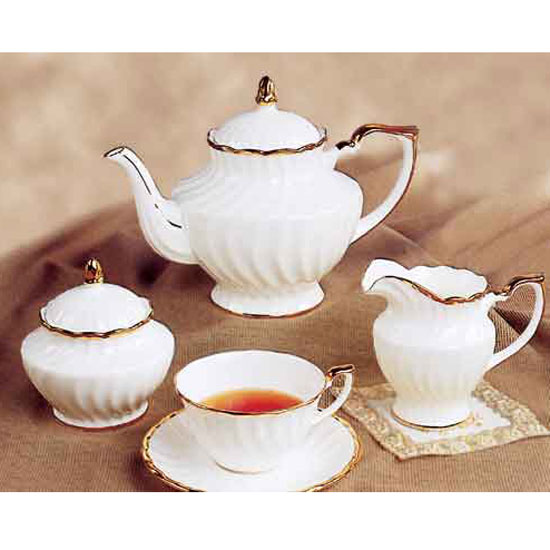 This elegant coffee set is crafted of white ceramic accented with golden-toned trimming. The exclusive coffee set includes a coffee pot, a cup, a plate as well as sugar and creamer containers. The exquisite coffee set is perfect as a house warming and wedding gift.