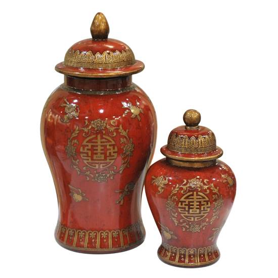 This is a set of two ceramic decorations. They come with Chinese design in red colour. They feature a lid.