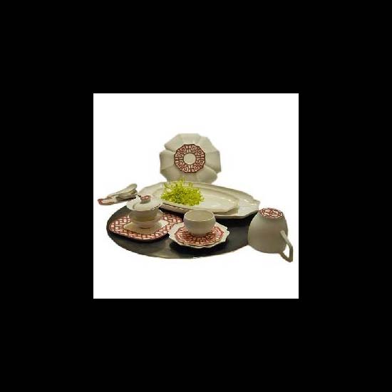 • The ceramic dinnerware is decorated in detailed Chinese patterns.