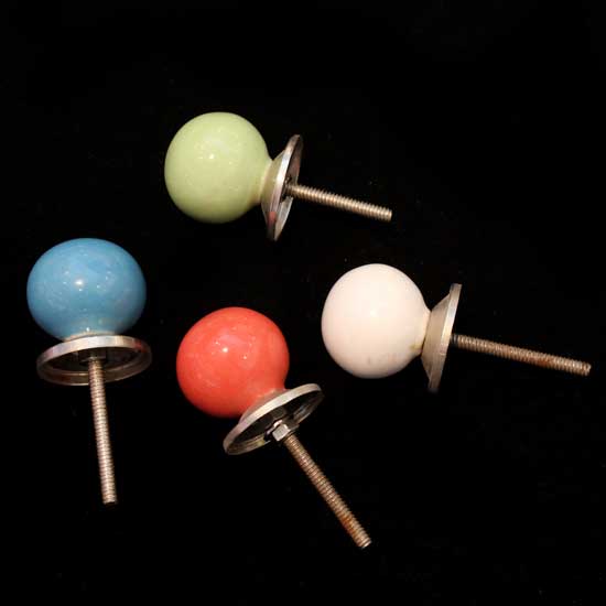 These smooth, round door knobs are made of ceramic and painted with bright colors. The durable door knobs can stand daily tear and wear. They are designed with long screw bases for easy installation.