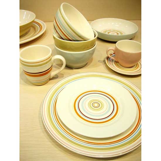 This ceramic earthen dinner set includes cups, plates, bowls and server plates. They are styled with stripes of varied widths in vibrant colors. This dinner set will make nice visual complements to any food.