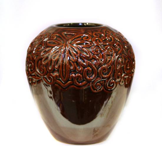 The featured product shown is a ceramic flower pot with an even surface of floral scroll patterns on the upper half. It has a narrow mouth but wide body, showing an artistic and antique style.