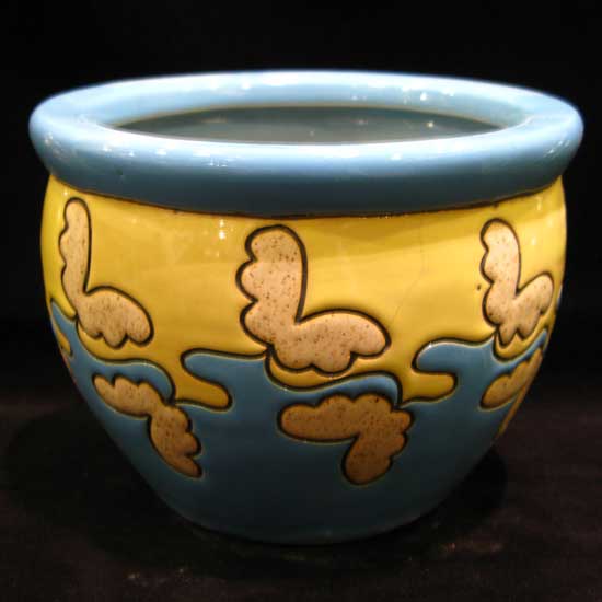 The ceramic flower pot is exquisitely crafted to give a glossy finish. The abstract patterns and unique blue and yellow construction add a decorative touch. This flower pot serves as a great gardening tool.