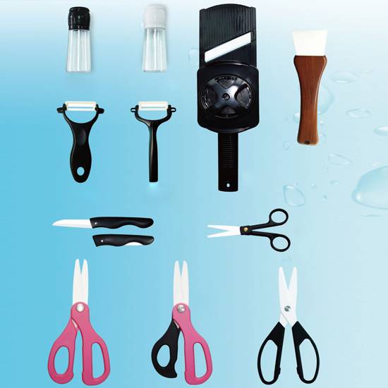 This is a set of ceramic kitchenware for the versatile and busy kitchen supervisor. It features utensils such as knife sharpeners, peelers, mills, and scissors. All utensils are made from quality stainless steel and are fitted with ergonomic handgrip handles.