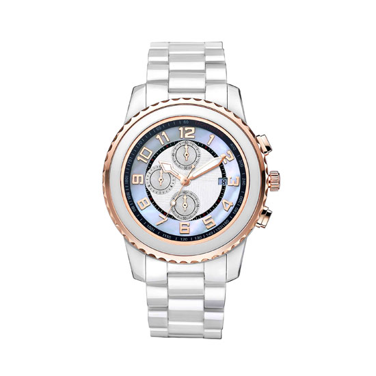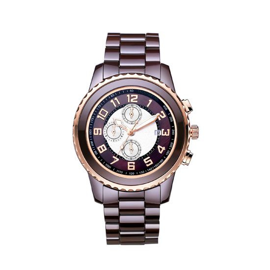 This watch features a two-tone dial decorated with chronographs, three hands, a date wheel and Arabic numeral markers, all of which are set in a scalloped, rose gold colored bezel. The dial is beautifully supported by a chocolate-brown ceramic band. Three side crowns further accentuate the watch, making it a grand, luxurious timepiece for both casual and smart outfits.