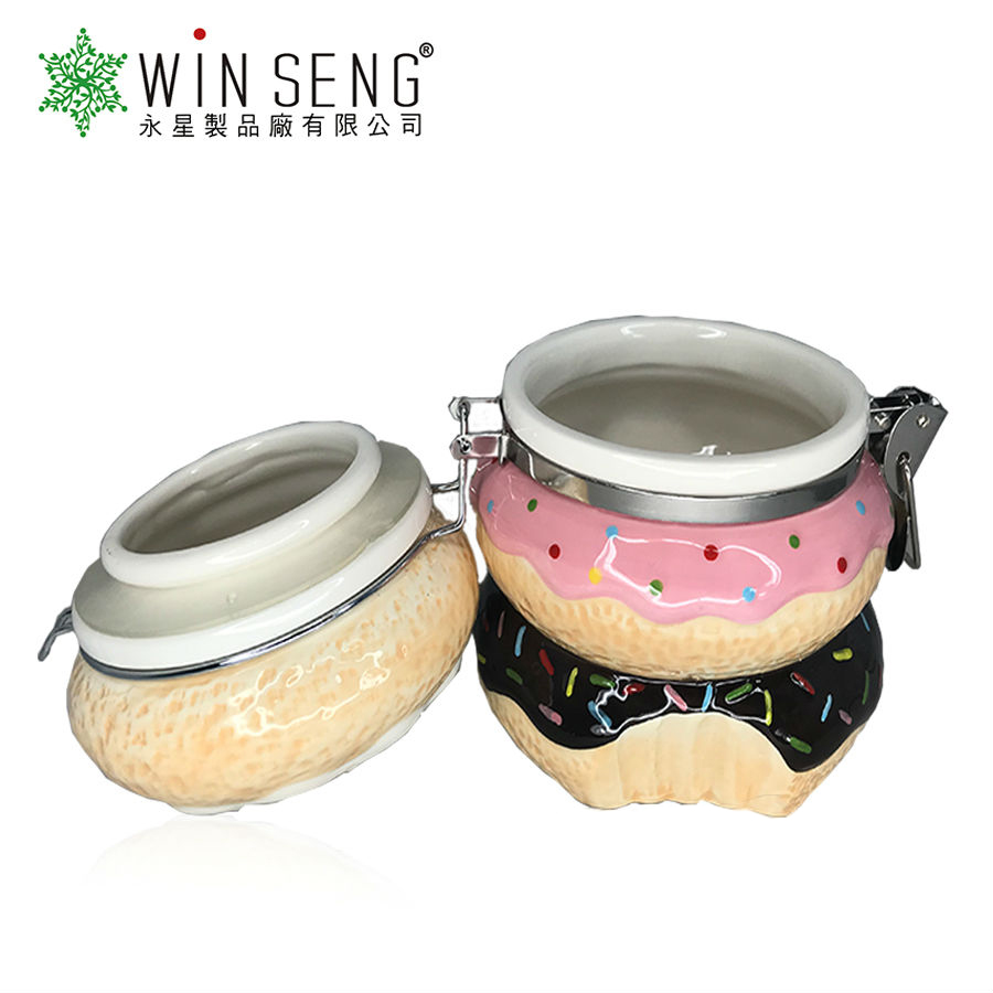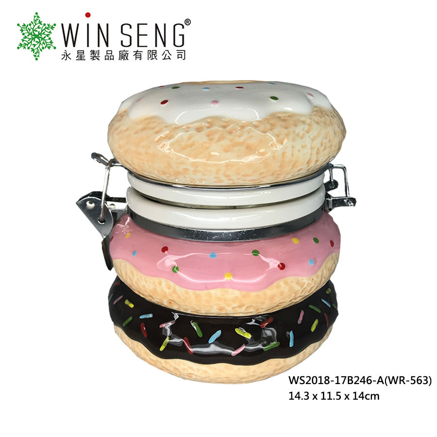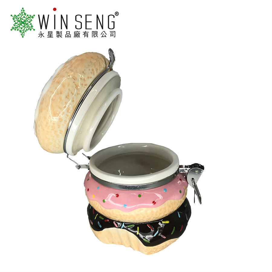 Store cookies and other baked goods with this ceramic storage jar. It comes in a colorful three-layered donut design and has a hinged lid with clamp closure. This ceramic storage jar offers hygienic and reliable storage and looks great on the countertop.