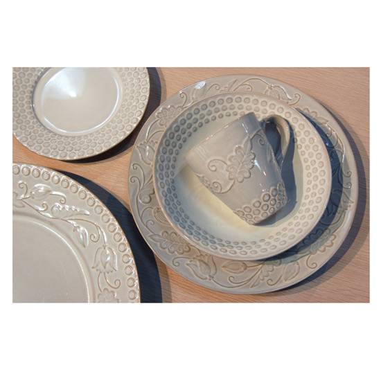 These ceramic tableware set are well-designed stoneware from Persia Collection. It includes three plates in different sizes and a mug. Each pieces have nice embossed patterns.