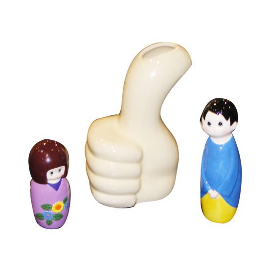 This is a ceramic vase with money boxes. The featured vase is made in a 'thumbs up' gesture, which conveys a positive message. The money boxes feature small adorable dolls and can be used for storing coins.