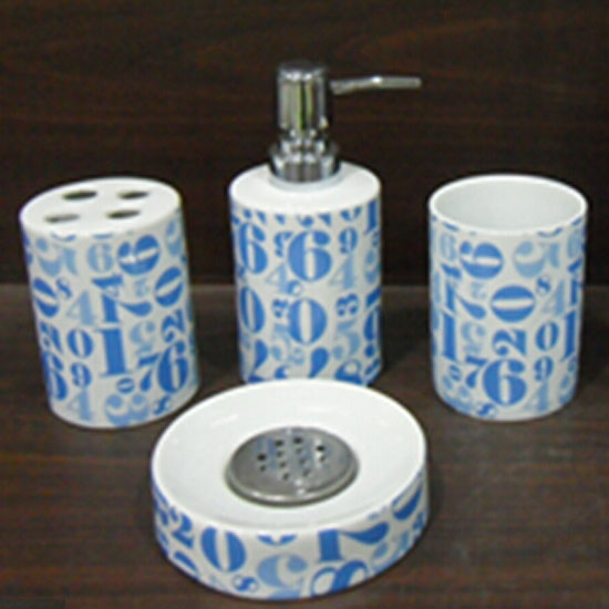 This ceramic wash set includes a lotion bottle, a toothbrush holder, a tooth mug and a soap holder with a matching design. The ceramic material gives each piece a sleek and high-gloss finish. The modern and elegant design blends into your bathroom easily.