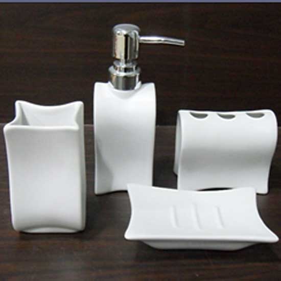 This ceramic wash set includes a lotion bottle, a toothbrush holder, a tooth mug and a soap saucer. All the pieces are made of top-quality ceramic material. This modern wash set makes an ideal addition to complete any bathroom.