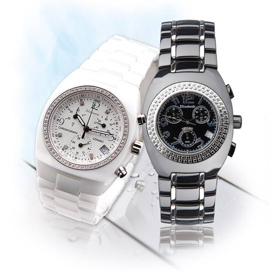 • As shown are two wrist watches with fine ceramic case and band in black and white.