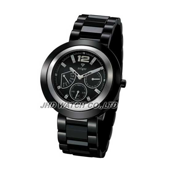 This black-toned watch is made of ceramic. It features a round dial with two hands and three sub dials. This cool watch is sure to dress your wrist with charm.