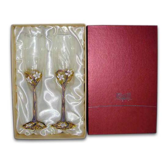 A set of champagne glass is packed in a gift box. The set is in elegant style. The set includes two pieces of tumbler.