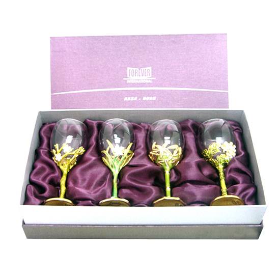 A set of champagne glass is packed in a gift box. The set is in elegant style. The set includes four pieces of tumbler.