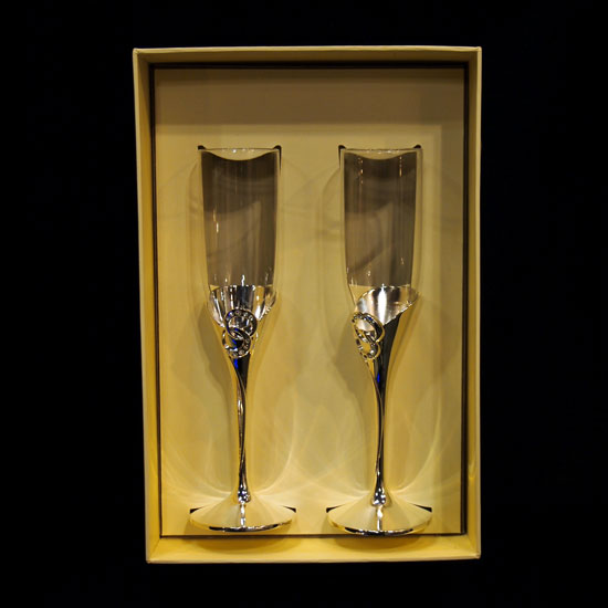This pair of champagne glasses features an elegant combined structure in metal and glass. The silvery stem and foot are decorated by linked ornaments. These beautiful glasses make a remarkable gift for your friends in various occasions.