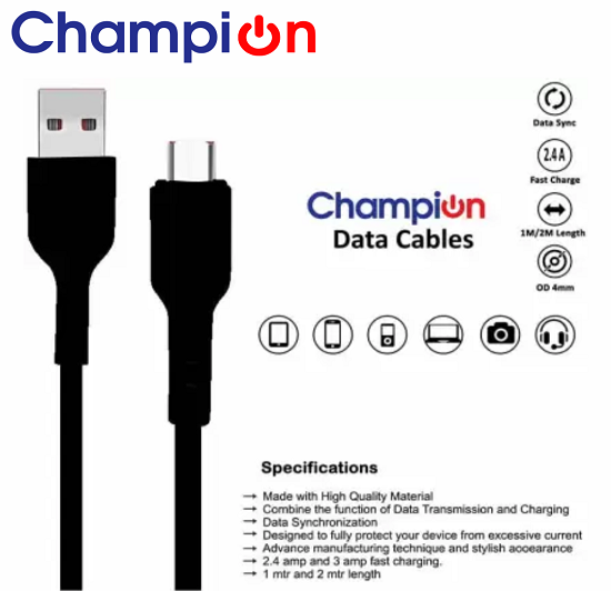 The Champion USB to Micro 3Amp Data Sync & Charging Cable offers superior charging speed and data transfer for all Android and Micro USB devices. Crafted with durable PVC material, this 1-meter cable is flexible, lightweight, and tangle-free, ensuring long-lasting performance.