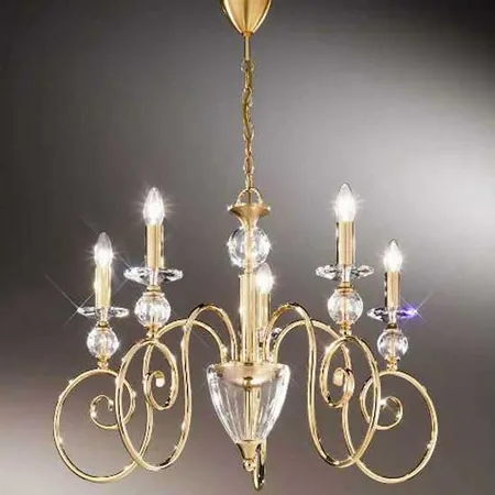 This golden chandelier lamp flaunts 5 arms with candle bulbs. The curvy details and crystalline adornments lend aristocratic grace to the appearance. This ornate chandelier is an ideal choice to glam up your home decor.