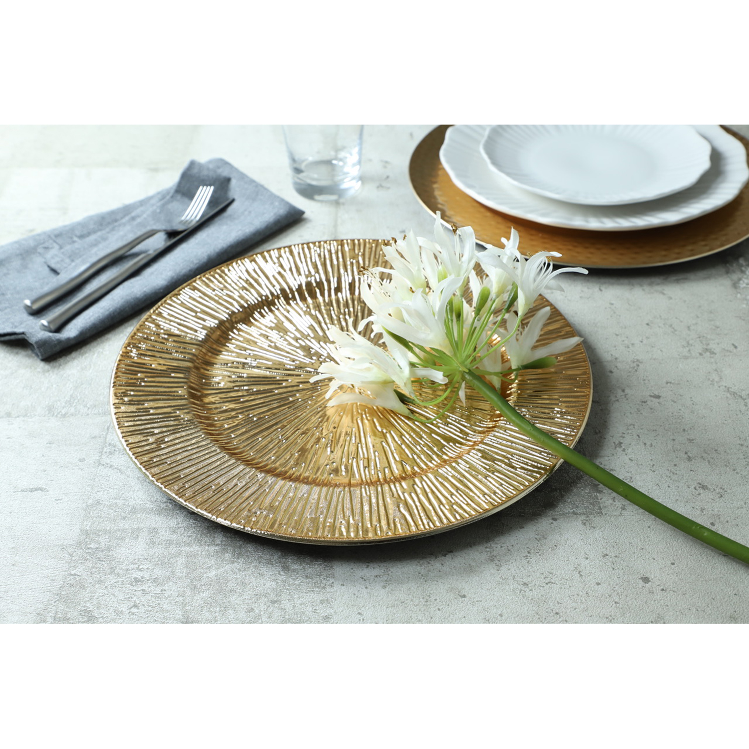 Radiating with a rich golden hue, this charger plate features a unique, embossed wood grain finish hat instantly elevates the dining room with a touch of opulence. It is a plate made of polypropylene (PP), which makes it a durable, lightweight, heat-resistant, and even recyclable tableware addition to any kitchen.