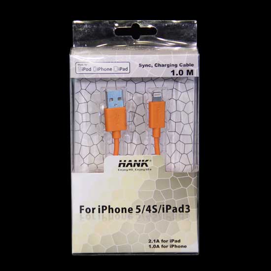 This charging cable is suitable for your iPhone 5, iPhone 4S and iPad 3. This charging cable comes in bright orange for an eye-catching look. This high-quality charging cable boasts a long service life.