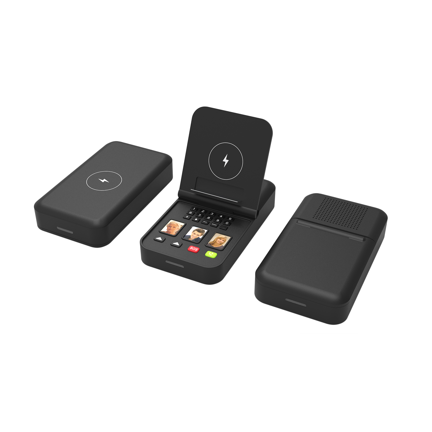 This senior-friendly Charging Dock is designed for ease of use in healthcare and elder care environments. It comes with a high-capacity portable battery and features hands-free speaker functionality for answering calls. The flip-open interface includes large raised keys, three photo dial buttons, an SOS emergency button, and adjustable volume controls for enhanced accessibility.