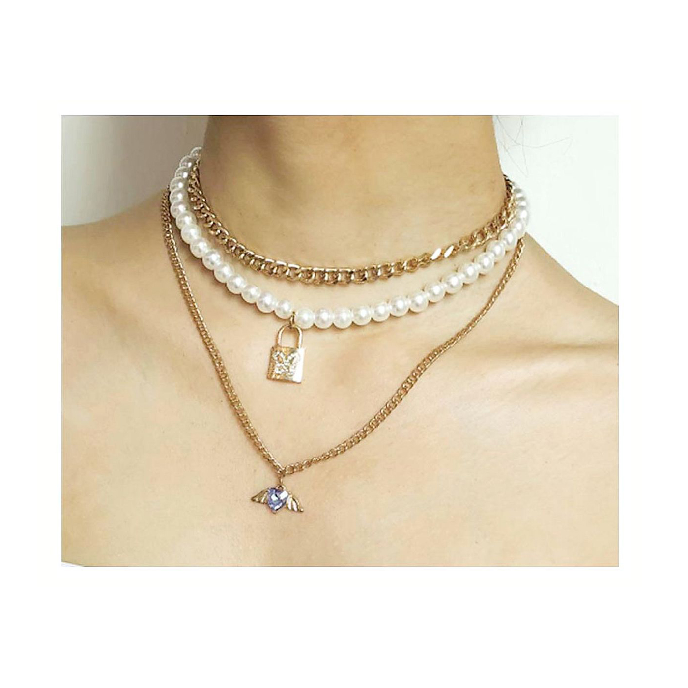 As shown is an elegant trendy necklace with multiple strands each highlighted by golden plated chains.