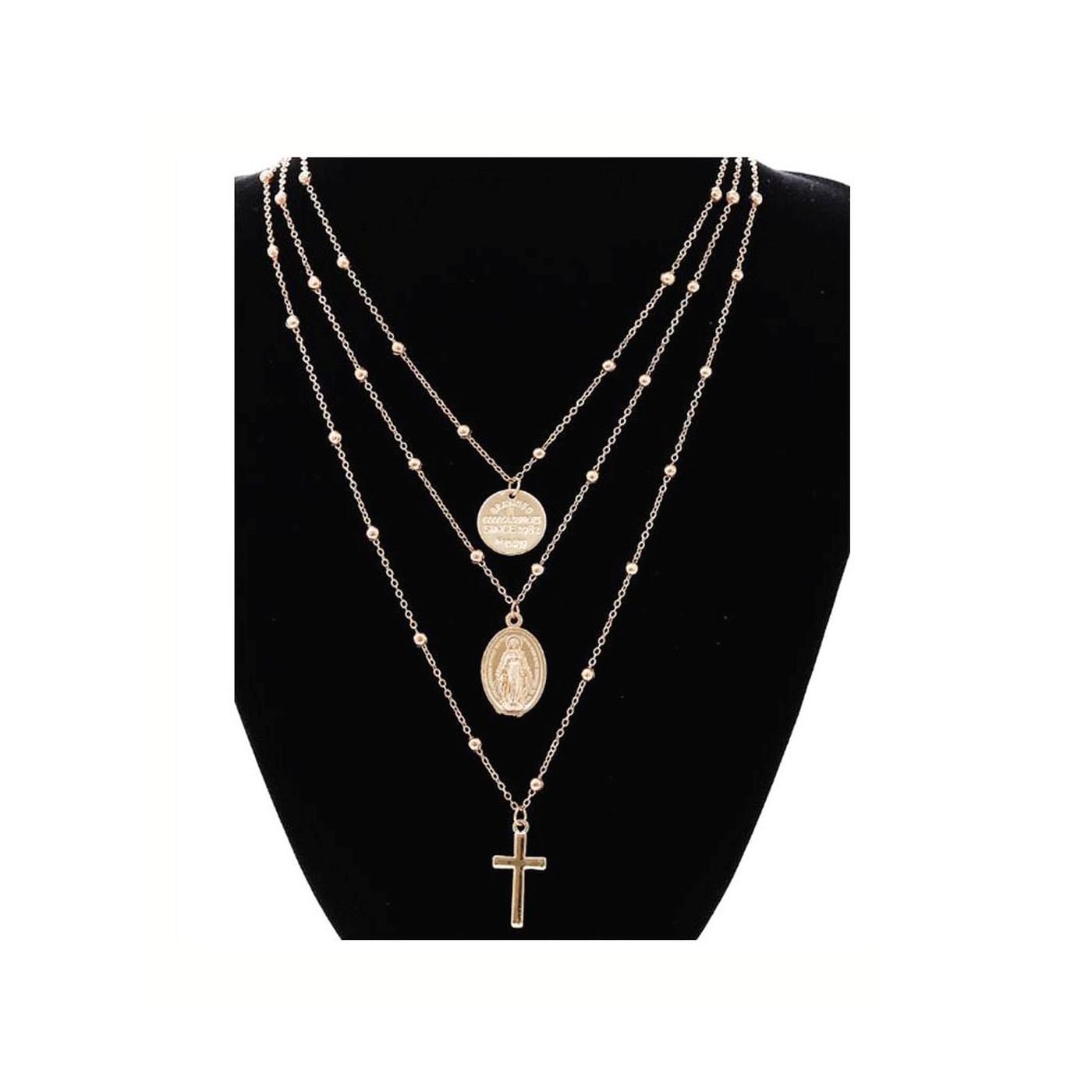 • As shown is an elegant trendy alloy pendant necklace with multiple strands each highlighted by metallic accessories.