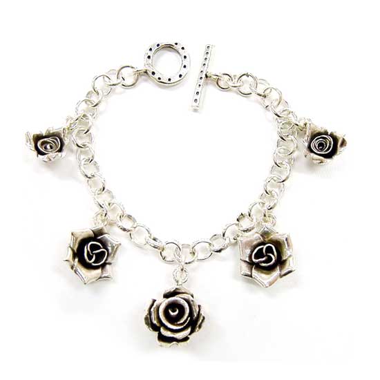 Showcased is a handmade silver bracelet with a glamorous appearance. It features rose charms for a touch of romance. This handmade silver bracelet is a great gift for your beloved one.