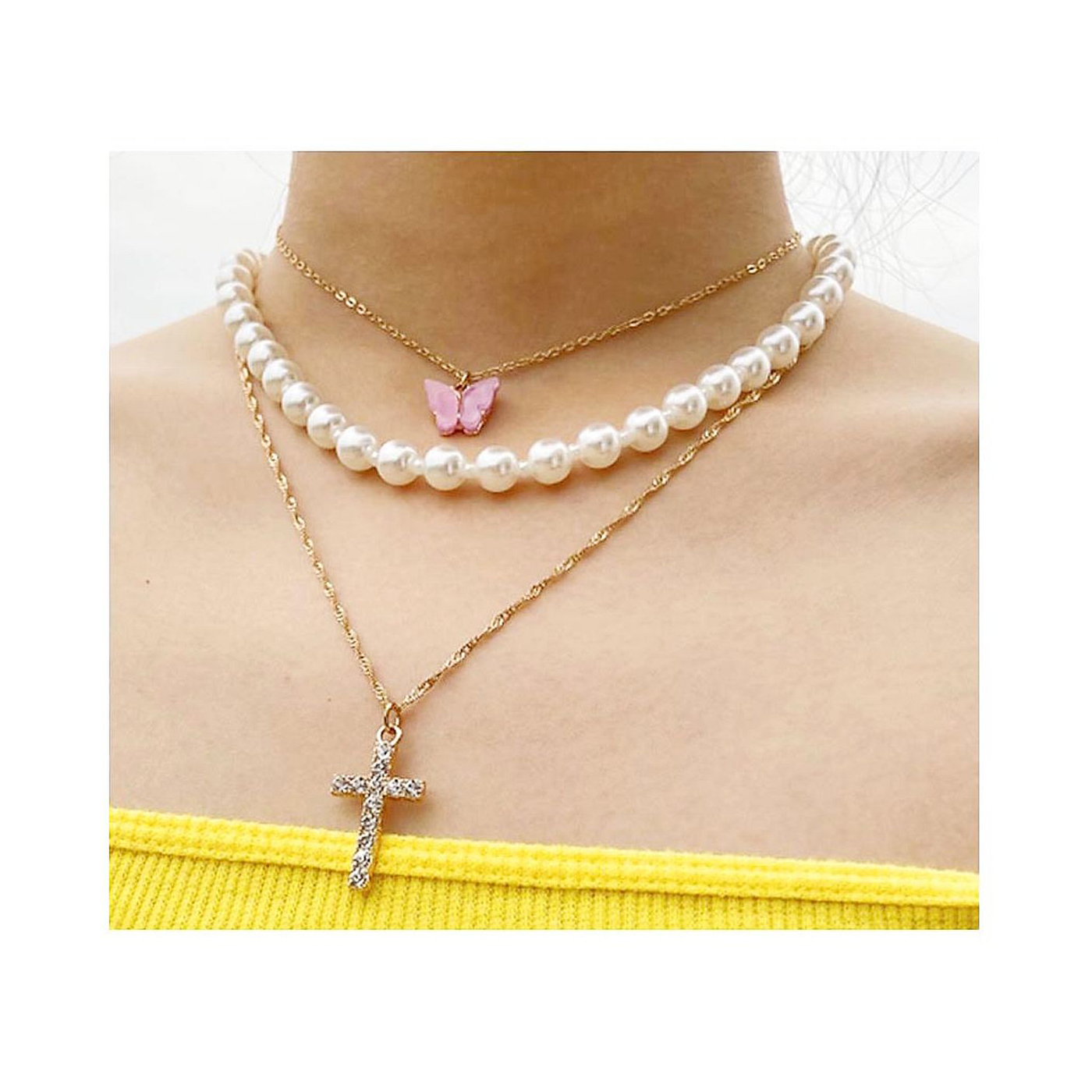 Charm Cross Alloy Parts Golden Plated Multi Strand Chains Necklace