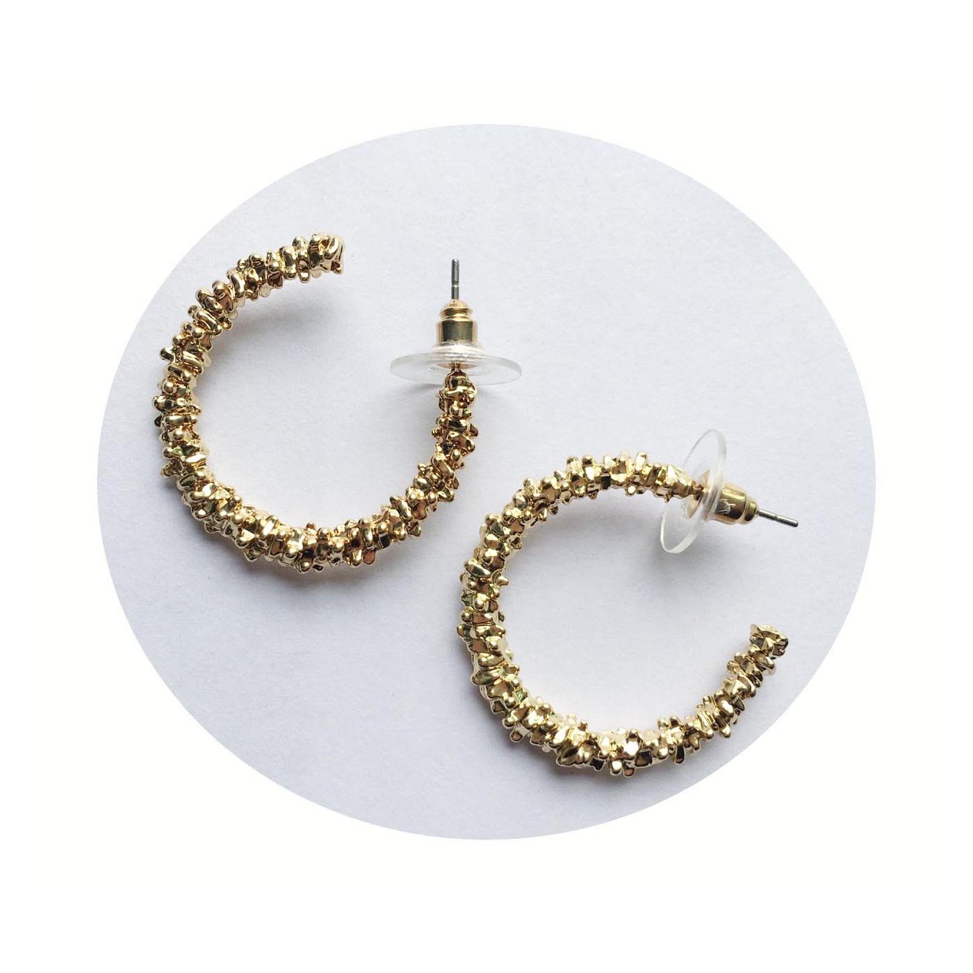 • As shown is a high-fashion golden plated circle charm hoop earring.