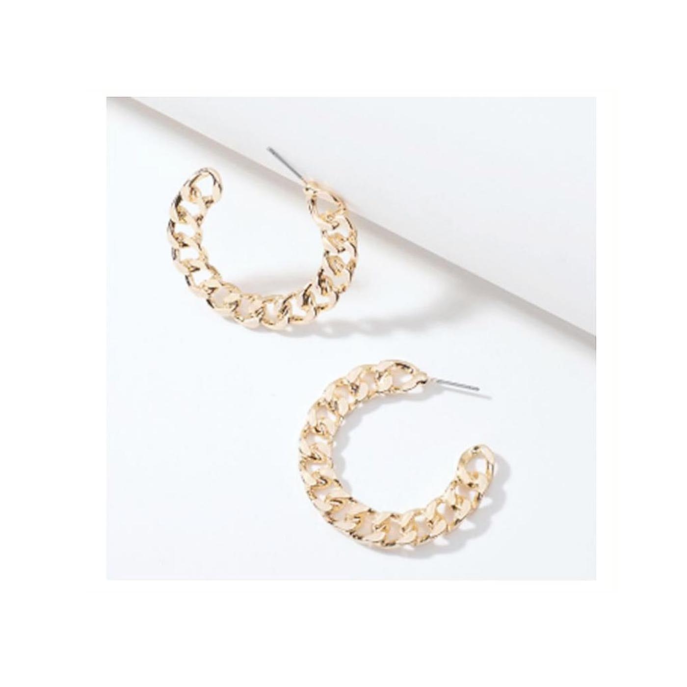 • As shown is a high-fashion golden plated circle charm hoop earring.