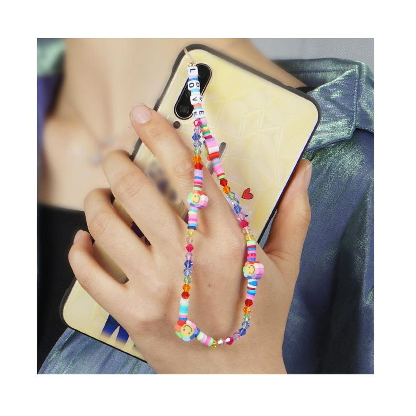 • As shown is a high-fashion mobile phone string with multi colors clay materials.
