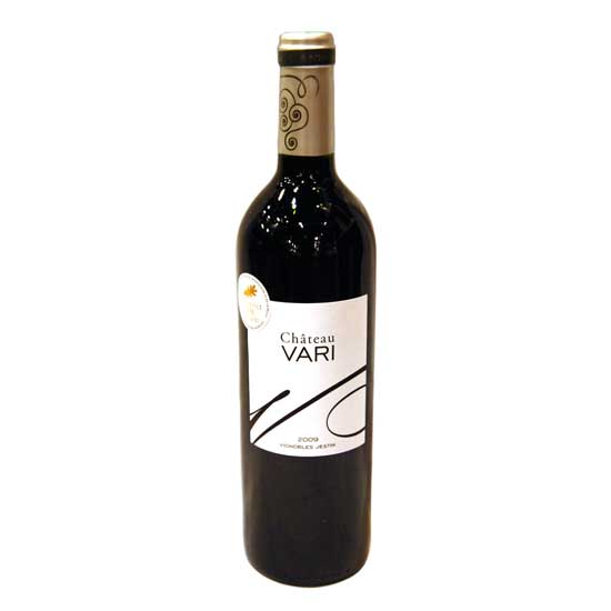 Featured is a bottle of Bordeaux red wine produced in Chateau Vari. It exhibits refined, delightful aromas and flavors. This dry wine is a great choice for pairing with meat dishes.