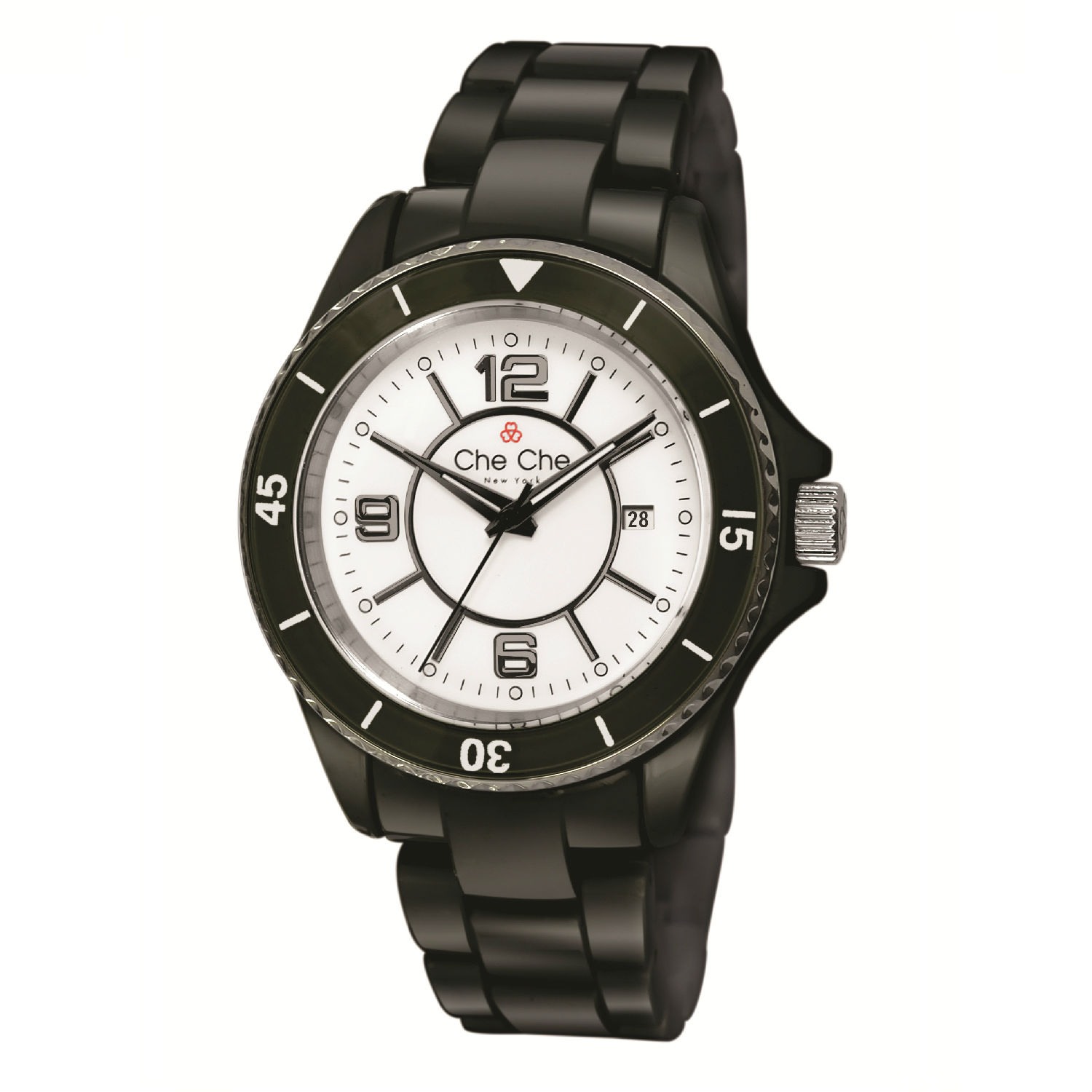 Complete your look with this smart and stylish analog watch. This timepiece comes in a rather sporty style with its 60-minute bezel ring embellished on the round case. The ceramic dial is easy to read with its stick and Arabic hour markers and slender dauphine hands.
