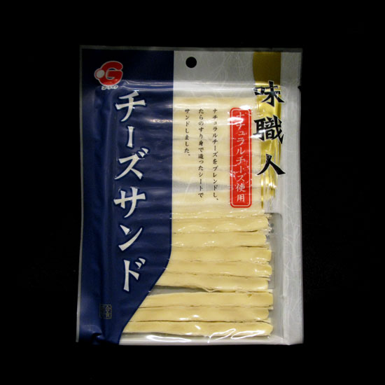 Displayed is a pack of sandwiched snack made with cheese and cod fish from Hokkaido. The creamy cheese strips and seasoned cod fish fillings are sandwiched to give a fun texture in the mouth. Cheese and fish are rich in calcium and protein, which are good for kids’ general health.