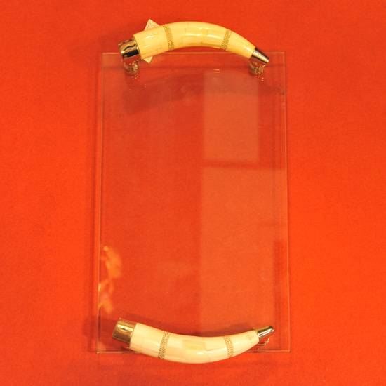 This is a tray for cheese with a transparent glass bottom. The tray features 2 horn shape handles made of bone. It is eye-catching with a primitive style.
