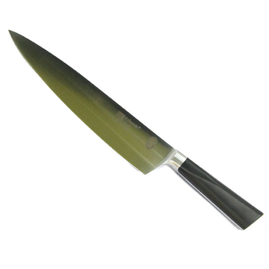 This chefs' knife flaunts a stylish design of a sharp, streamlined blade and a comfortable, black handle. Made with top-quality German steel, this knife helps you cut and carve with ease. This professional chefs' knife is a superb addition to your kitchen tools.